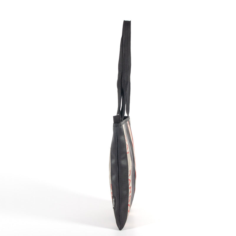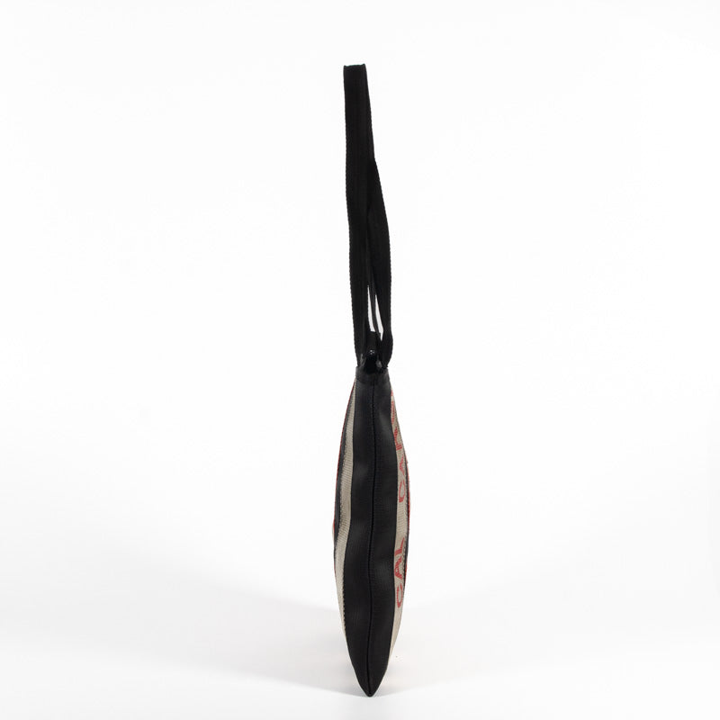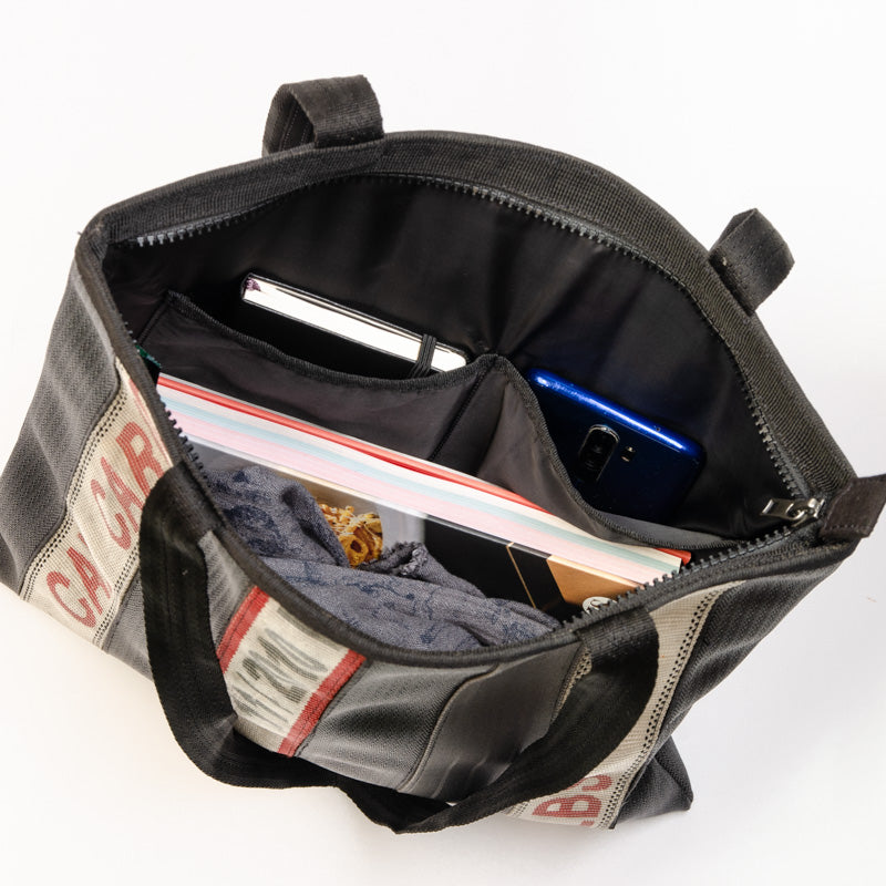 Esterno: Realizzato a mano utilizzando una combinazione di materiali: cinture di carico riciclate e cinture di sicurezza per auto usate.